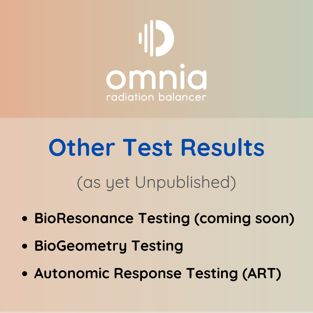 We present these 5 Test Results so you can see the body's response and understand the performance benefits we have recorded thanks to the Omnia Radiation Balancer. By testing across a range of modalities, we can triangulate our results to give a rounded picture of the benefit. However, our results are subjective and open to your interpretation in terms of the level of protection offered.